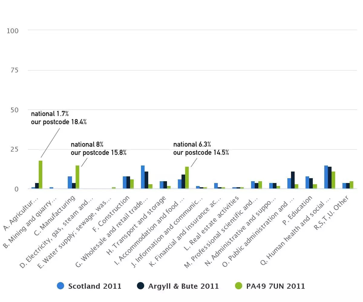 Die Destillierbranche ist ein bedeutender Arbeitgeber hier. Zu den weiteren wichtigsten Industrien auf Islay gehören Tourismus, Landwirtschaft und Fischerei. Diese Grafik auf scotlandscensus.gov.uk verdeutlicht, wie der Arbeitsmarkt auf der Insel im Verhältnis zu den nationalen Daten steht, die von der Volkszählung 2011 stammen.