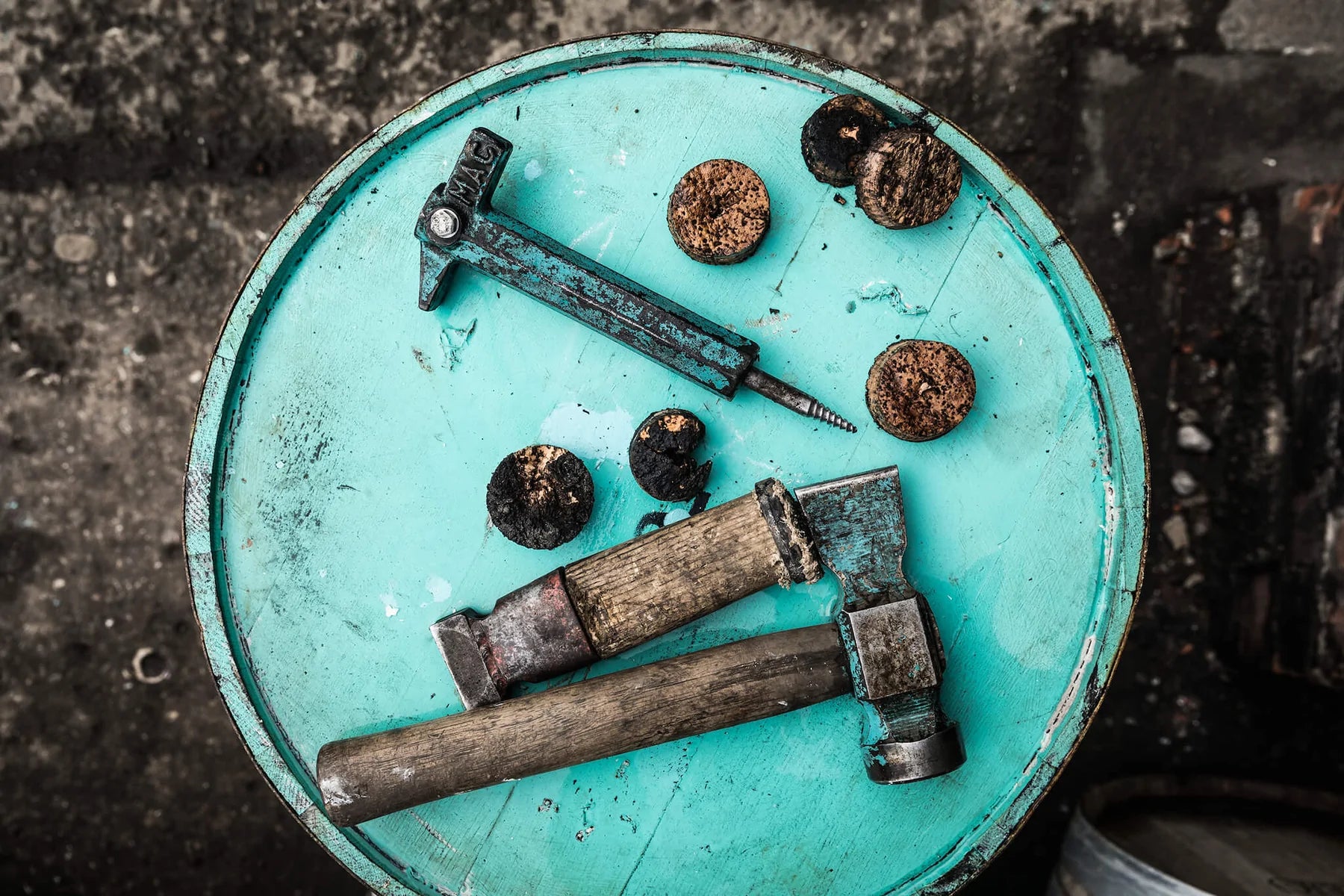 Der Vorgang, bei dem mit einem Holzhammer auf ein leeres Fass an der Stelle des Spundlochs geschlagen wird. Auf diese Weise wird der Stopfen lose. Das ist schneller, als ihn händisch herauszuziehen. Dies geschieht aber nur bei Bourbon-Fässern. Denn ihre Dauben sind dicker und robuster. Die edleren Weinfässer haben dünnere Dauben, die wiederum schneller Risse bekommen oder brechen.