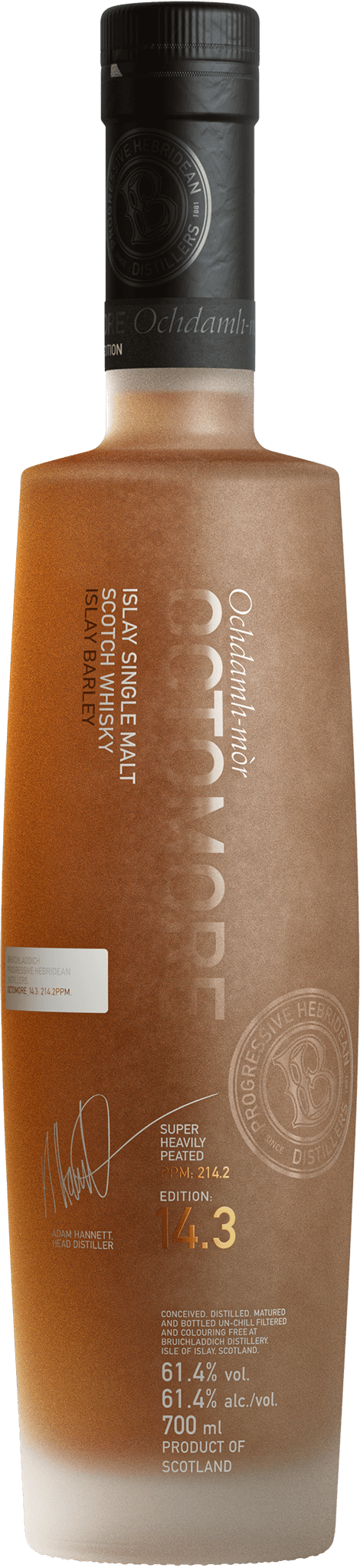 Octomore 14.3 demonstriert das außergewöhnliche Streben nach Geschmack, wenn er superstarken Torf mit den variablen lokalen Ernten seiner Inselheimat kombiniert.